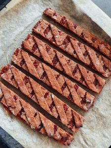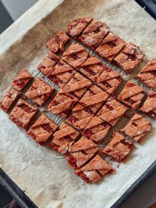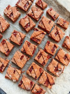 - Bake the Linzer slices for about 20-25 minutes until the surface is golden brown. Allow to cool completely and then cut into pieces.